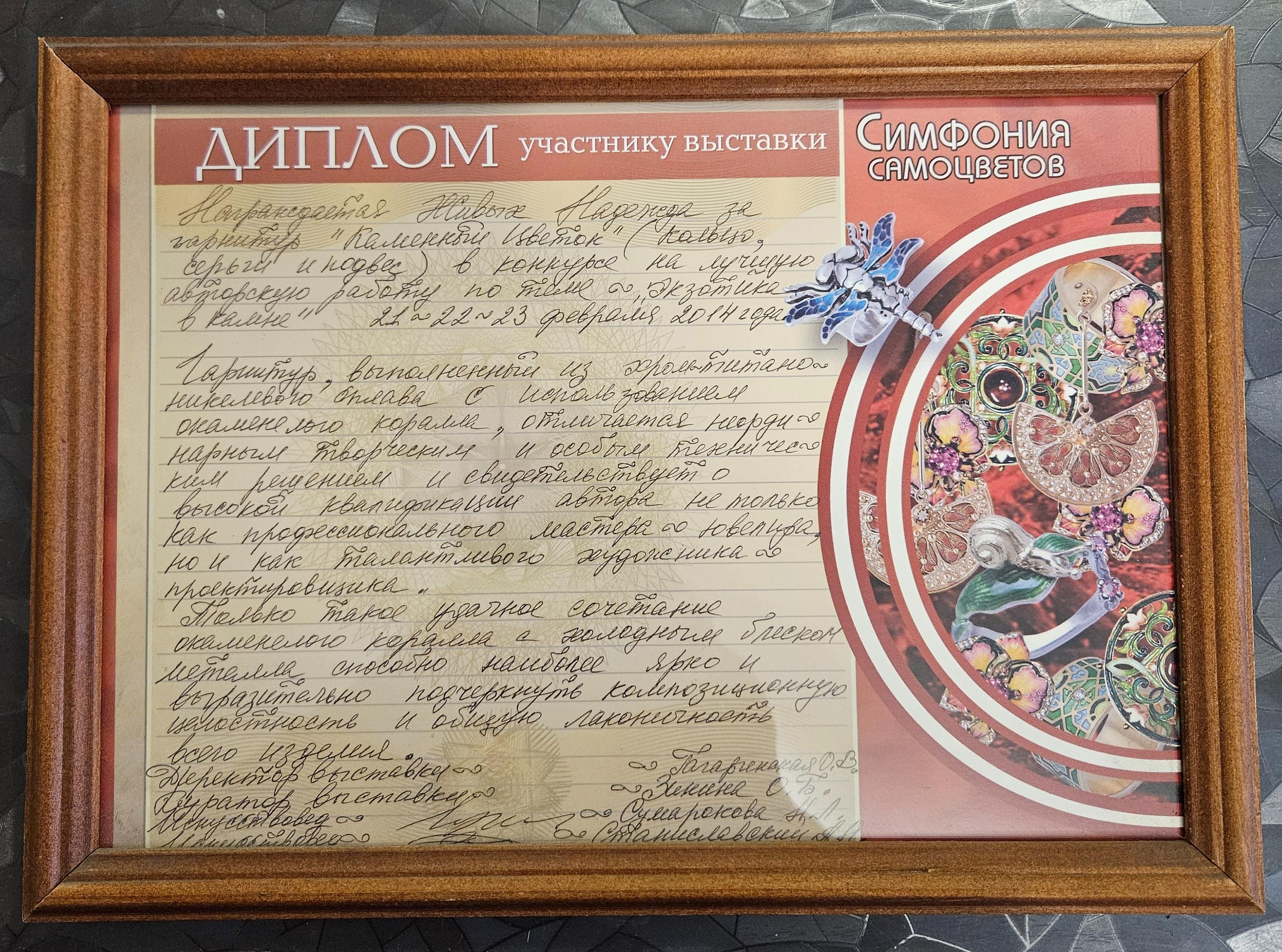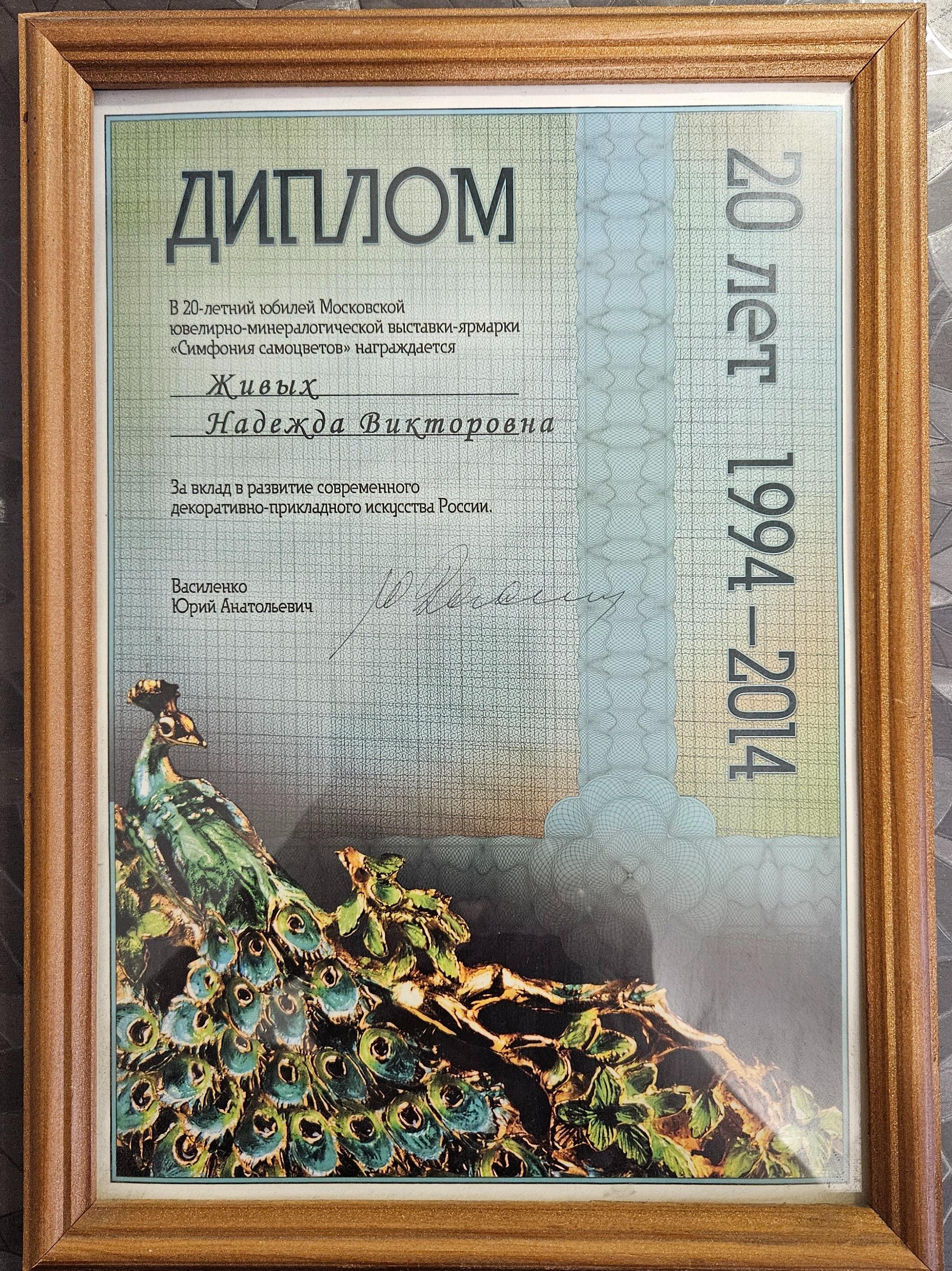 Надежда Живых считает большой честью принять эту высокую награду из рук Скурлова Валентина Васильевича, человека легенды, который посвятил свою жизнь изучению творчества фирмы Фаберже и всегда подчерчивал значимость преемственности традиций ювелирного и камнерезного искусства от творчества мастеров ушедшей эпохи к мастерам нового поколения.