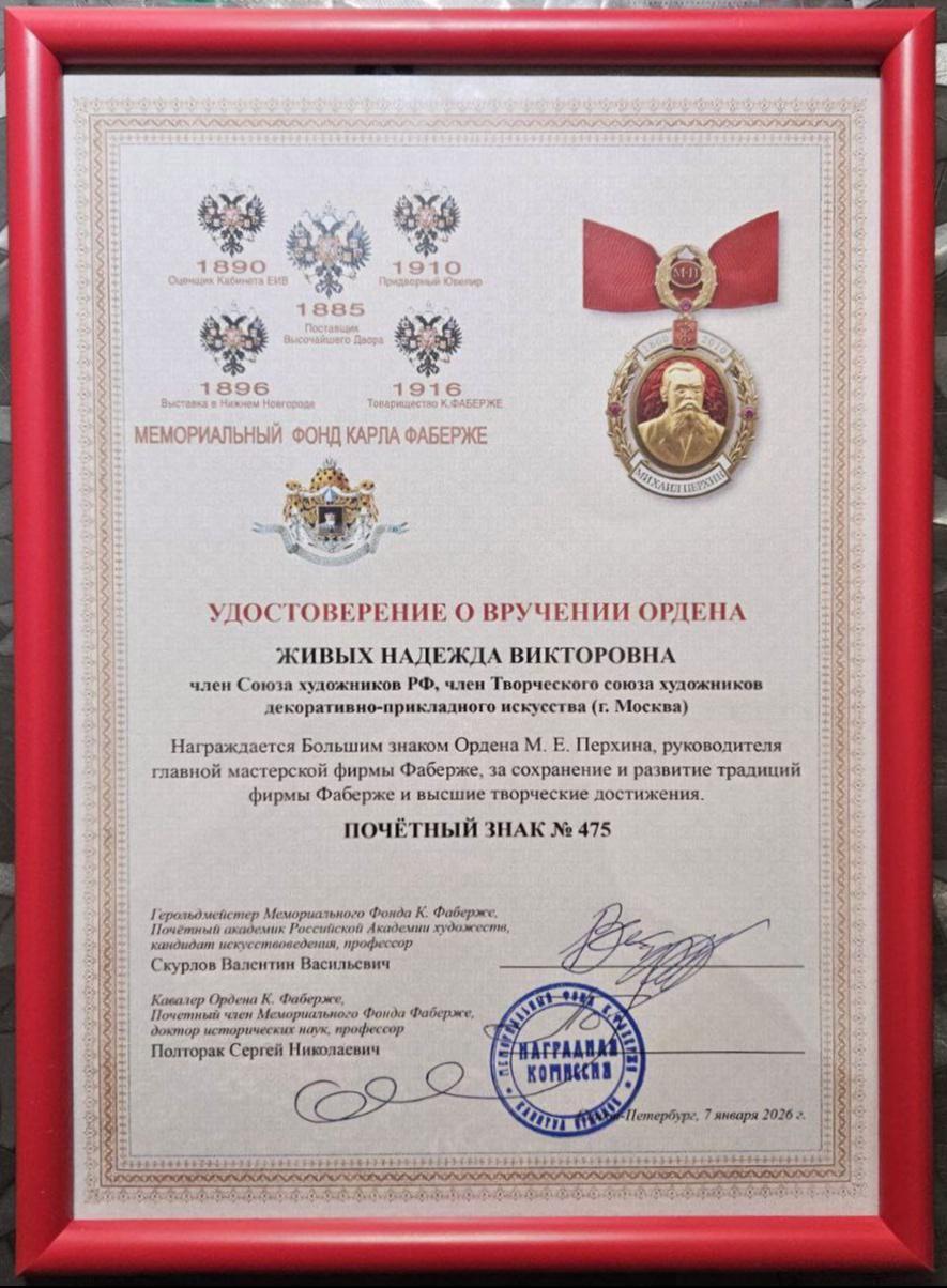5 февраля в Санкт Петербурге, в музее Христианской Культуры, в залах Карла Фаберже Надежду Живых и Сослана Зангиева наградили орденами Михаила Перхина Мемориального Фонда Карла Фаберже. Надежда награждена большим знаком ордена Михаила Перхина - это высшая награда для ювелиров.